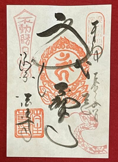 今月のご本尊「身代不動尊」のご朱印には〈宝剣の印〉と〈巳〉が赤色(薄紅色)で捺されております。