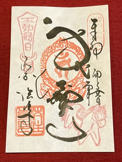 「午年」から馬の蹄(ひづめ)鉄を仏具に見立て、お不動さまのご真言(小呪/しょうじゅ)を刻んだ印が捺されております。上部の梵字は、〈不動明王〉と〈矜羯羅童子/こんがらどうじ〉と〈制咜迦童子/せいたかどうじ〉となっております。